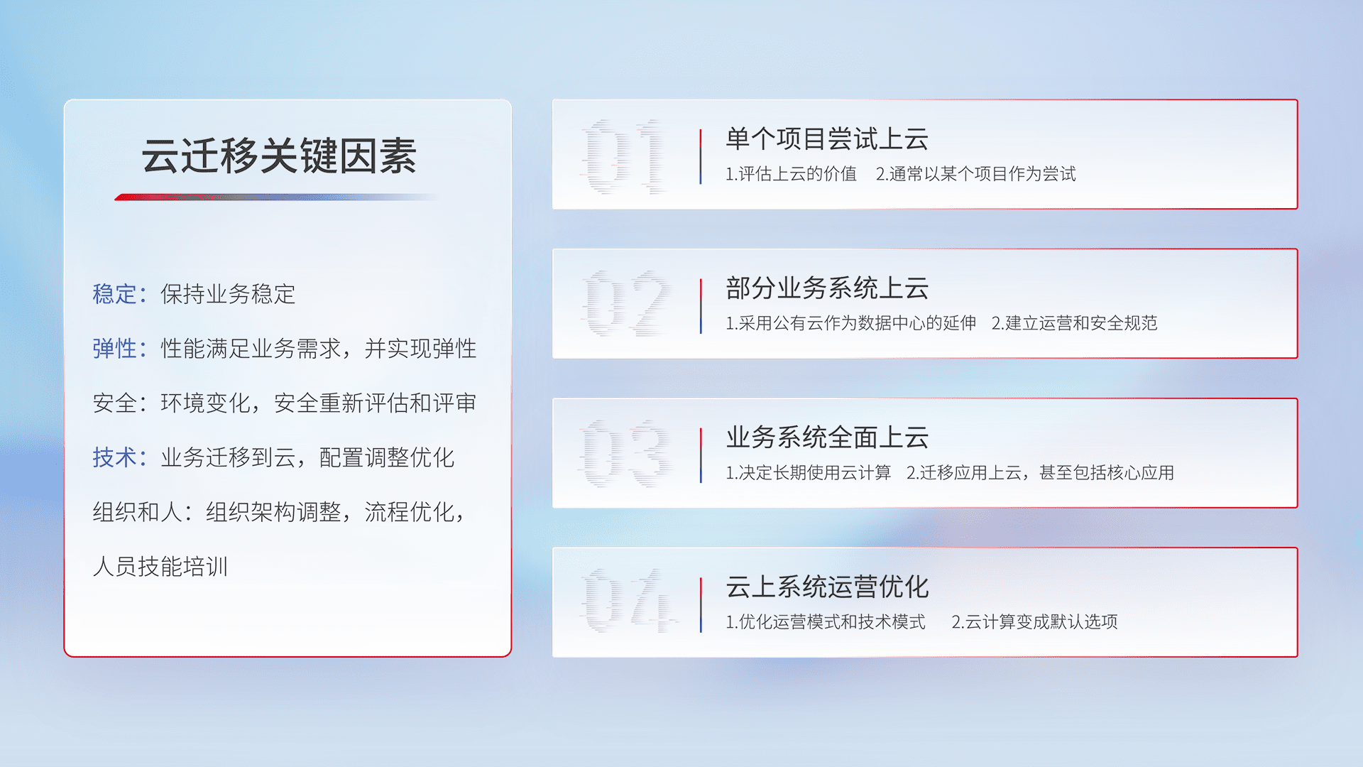 结合实际业务,,从规划设计、、、、云平台选型、、、、云原生改造、、、、数据迁移、、、、集成交付,,迁移全过程为客户识别最佳上云路径,,做好风险识别管理,,,设计网络架构、、、身份权限、、安全审计合规、、操作审计、、、日志审计、、、、监控告警策略、、多站点容灾设计等,,,,对云上基础设施进行整体规划,,提升IT治理水平,,以满足弹性、、高可用、、、高性能的需求。。。。