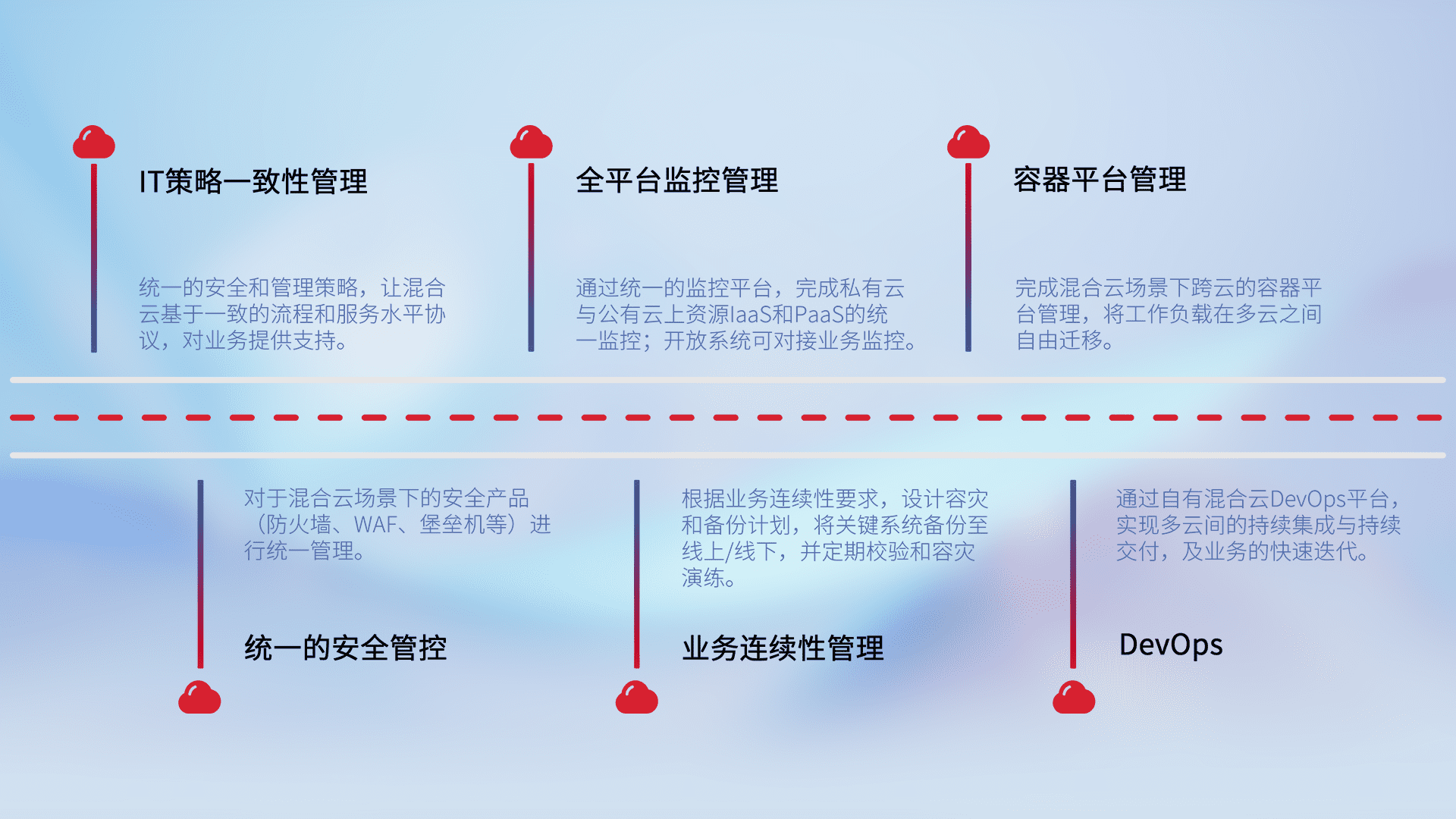 通过多云纳管,,以统一的资源数据模型把客户的云资源进行抽象和封装,,,,进而实现对多云资源的统一操作,,,,保障云资源管理的可靠性、、、稳定性与可用性。。量身定制化运维内容,,,,配置、、、、开发运维、、补丁管理、、、备份、、监控、、、认证和访问管理、、、、审计和日常巡检等,,,,保障在用云过程中的可靠度,,稳定度以及高可用率。。。。