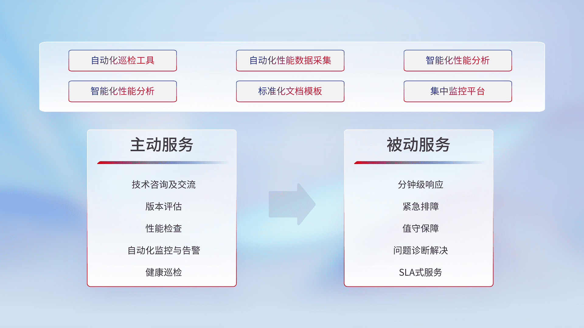 智能化工具和标准化文档,,保障服务质量,,提供主动服务(包含技术咨询、、版本评估、、性能检查、、、自动化监控与告警、、、、健康巡检)和被动服务包含(分钟级响应、、、紧急排障、、、、值守保障、、问题诊断解决、、SLA服务)。。